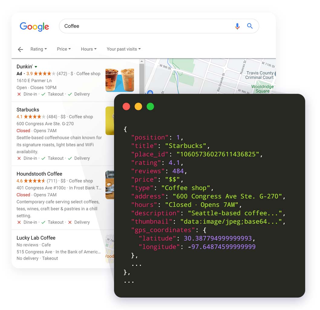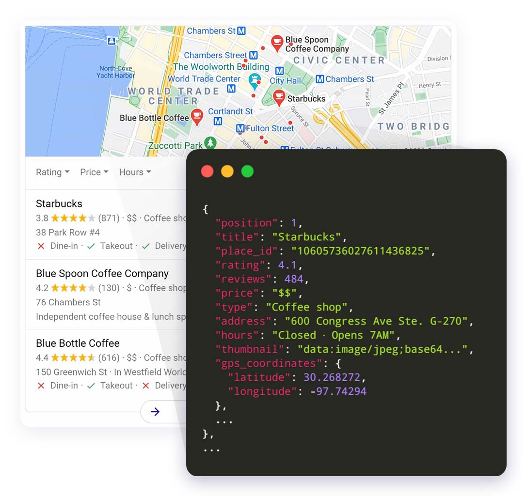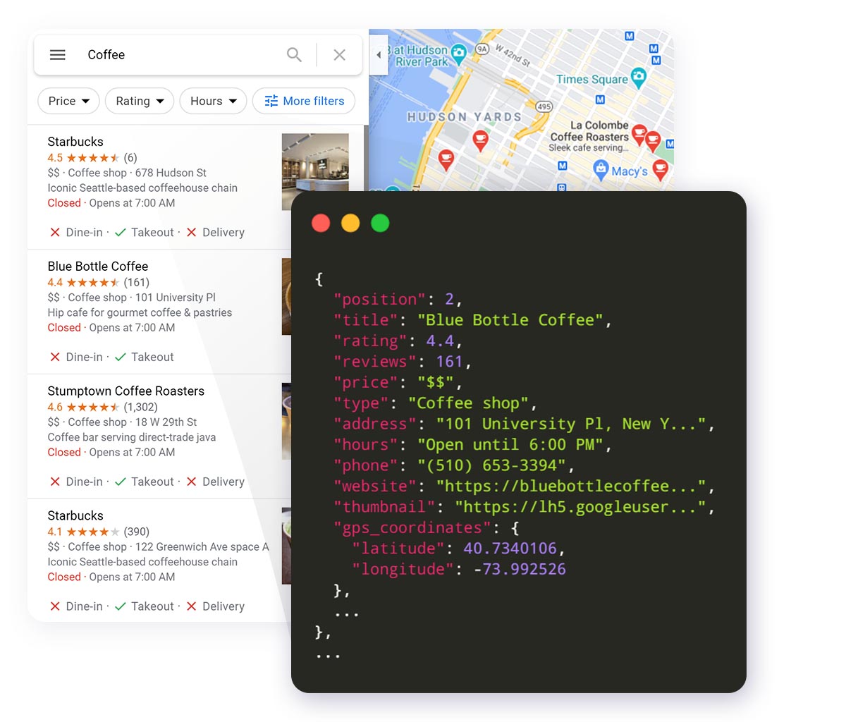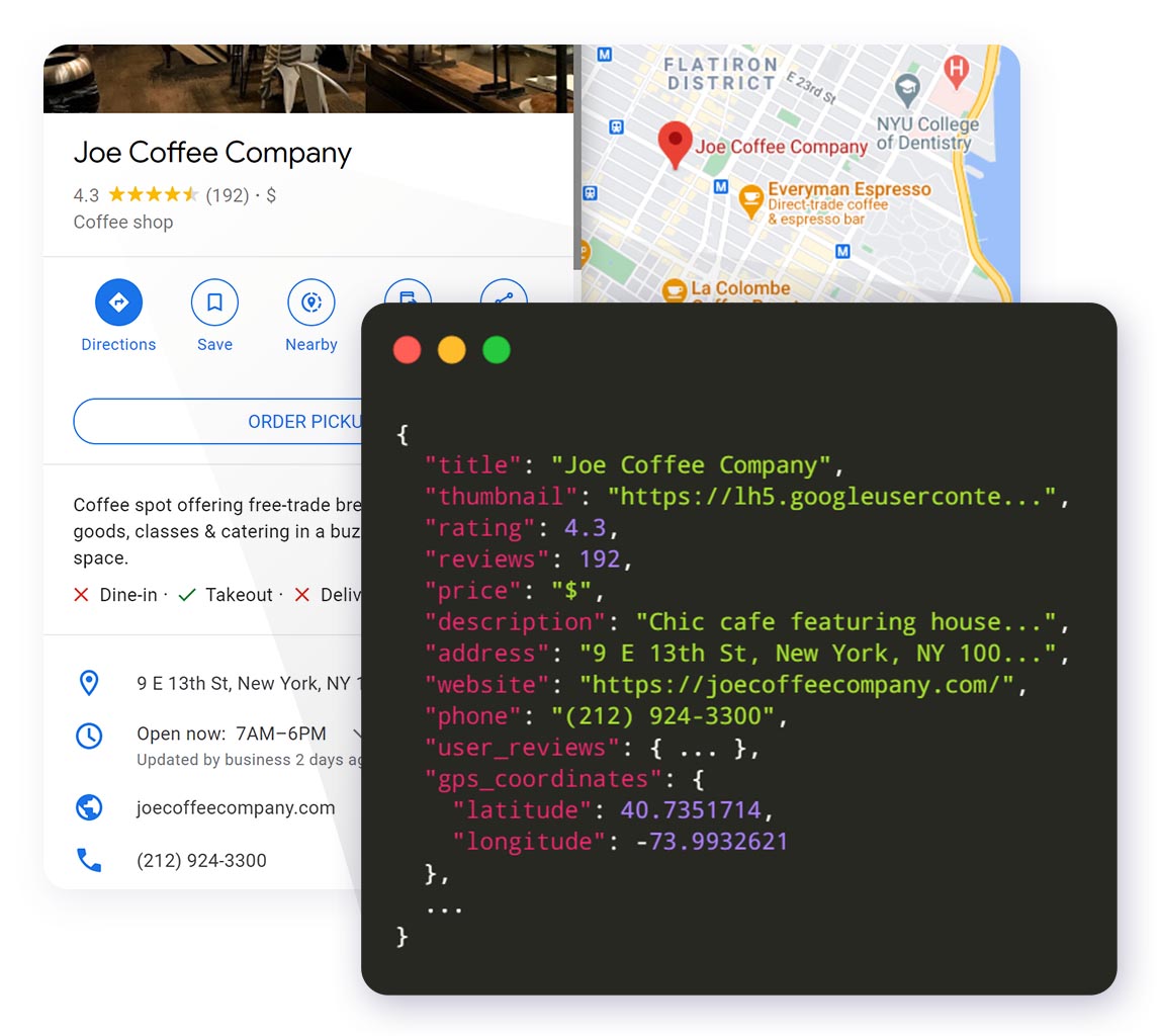 SerpApi can provide you with a full overview of any business featured on Google Maps SERP, including its address, reviews, phone as well as working hours.