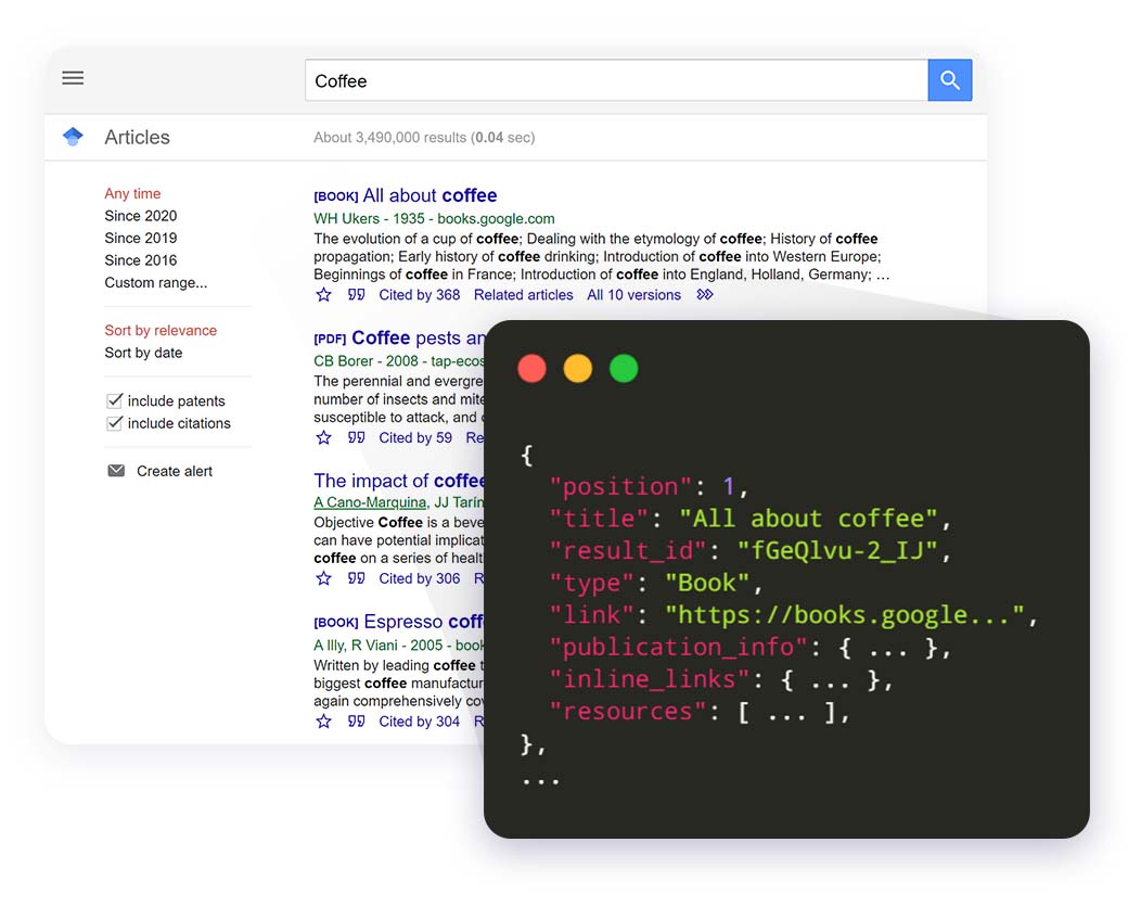 Another rich source of data is our Google Scholar API. Get access to an engine that indexes the full text or metadata of scholarly literature across an array of publishing formats and publishers.